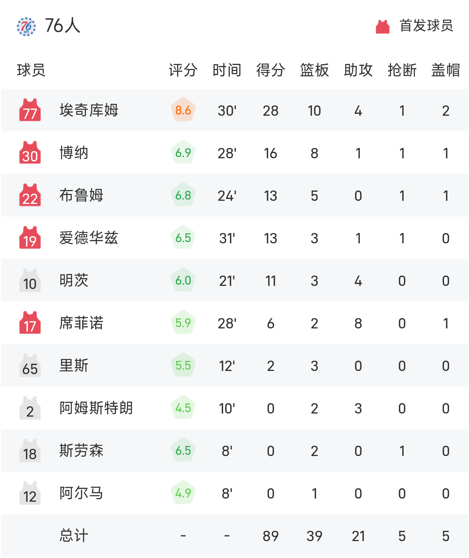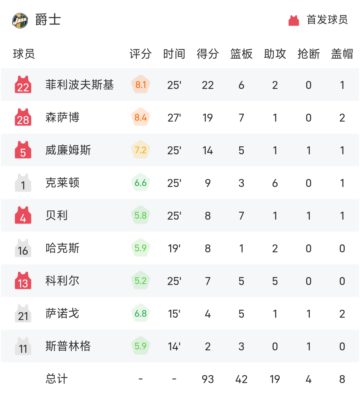 07月06日讯 25赛季夏季联赛,爵士对阵76人。双方全场战罢,爵士93-89战胜76人。菲利波夫斯基得到22分6板2助率队取胜,埃奇库姆空砍全场最高的28分10板4助。球员数据 查看更多详细数据 查看更多